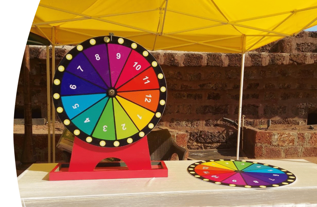 Participants spin a large wheel to win points or prizes.