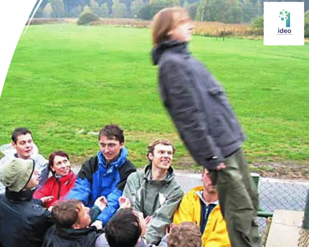 Trust Fall is a team-building activity where participants take turns falling backward into the arms of their teammates, building trust and confidence